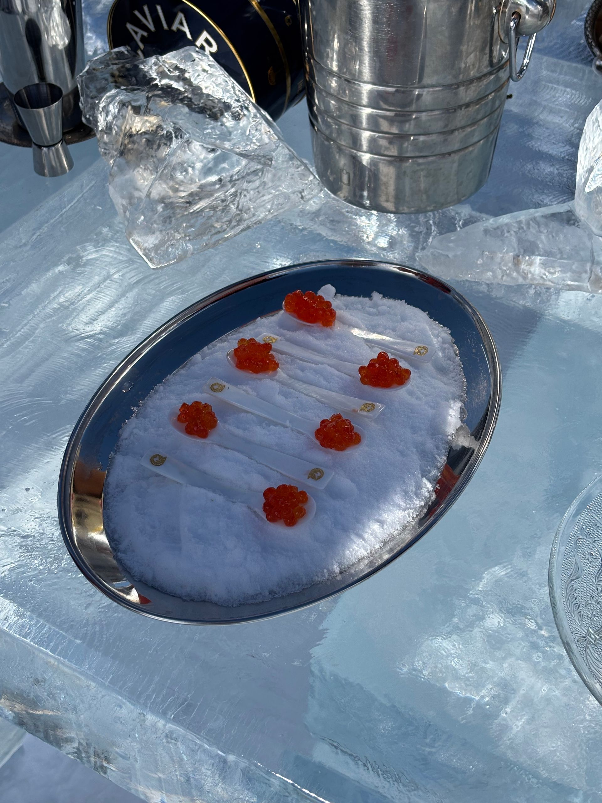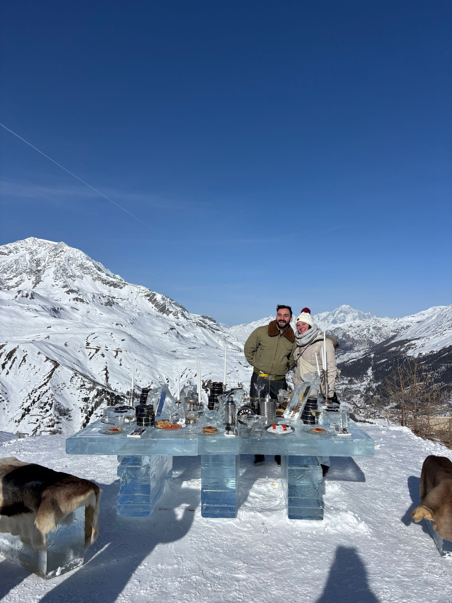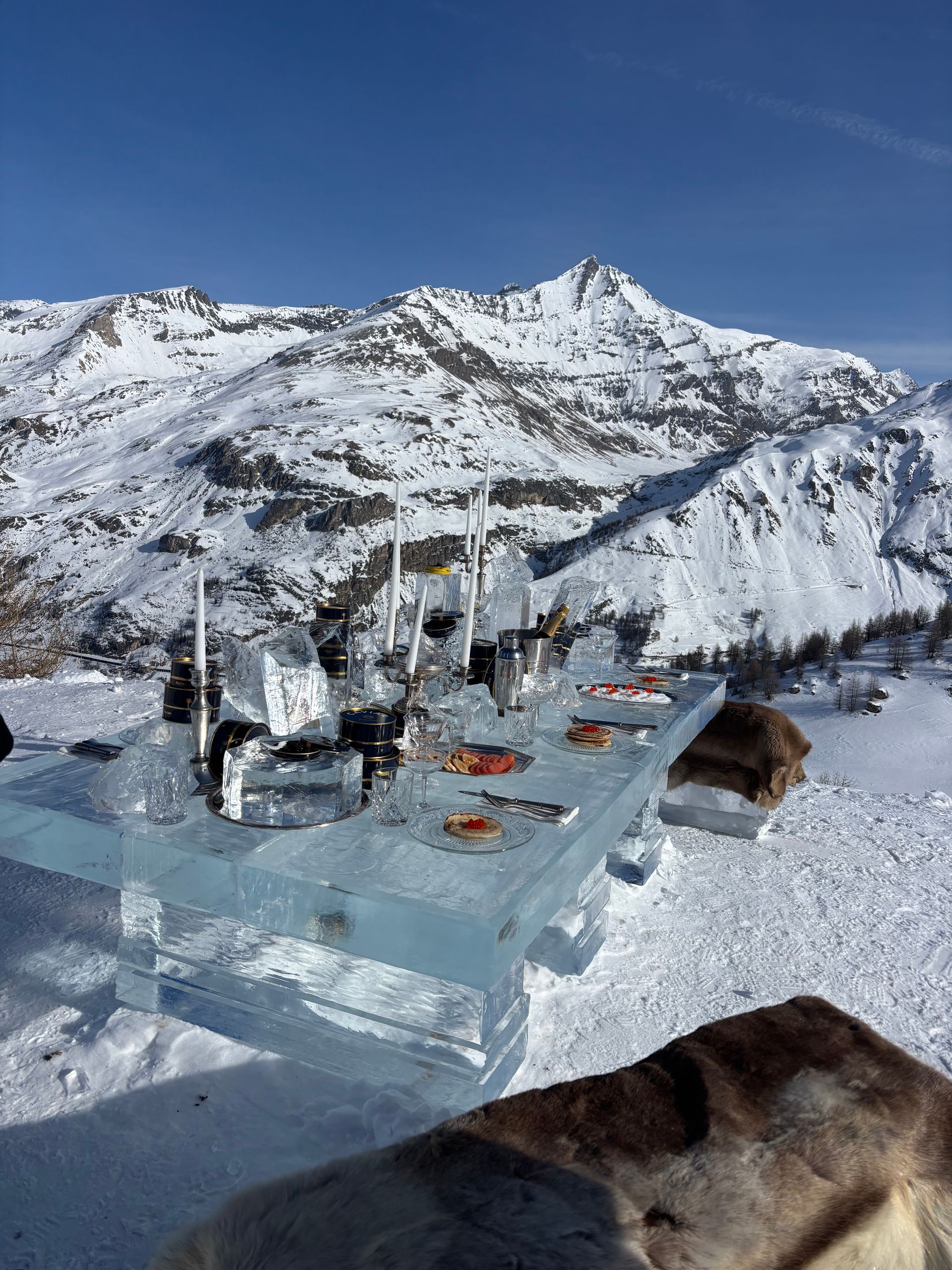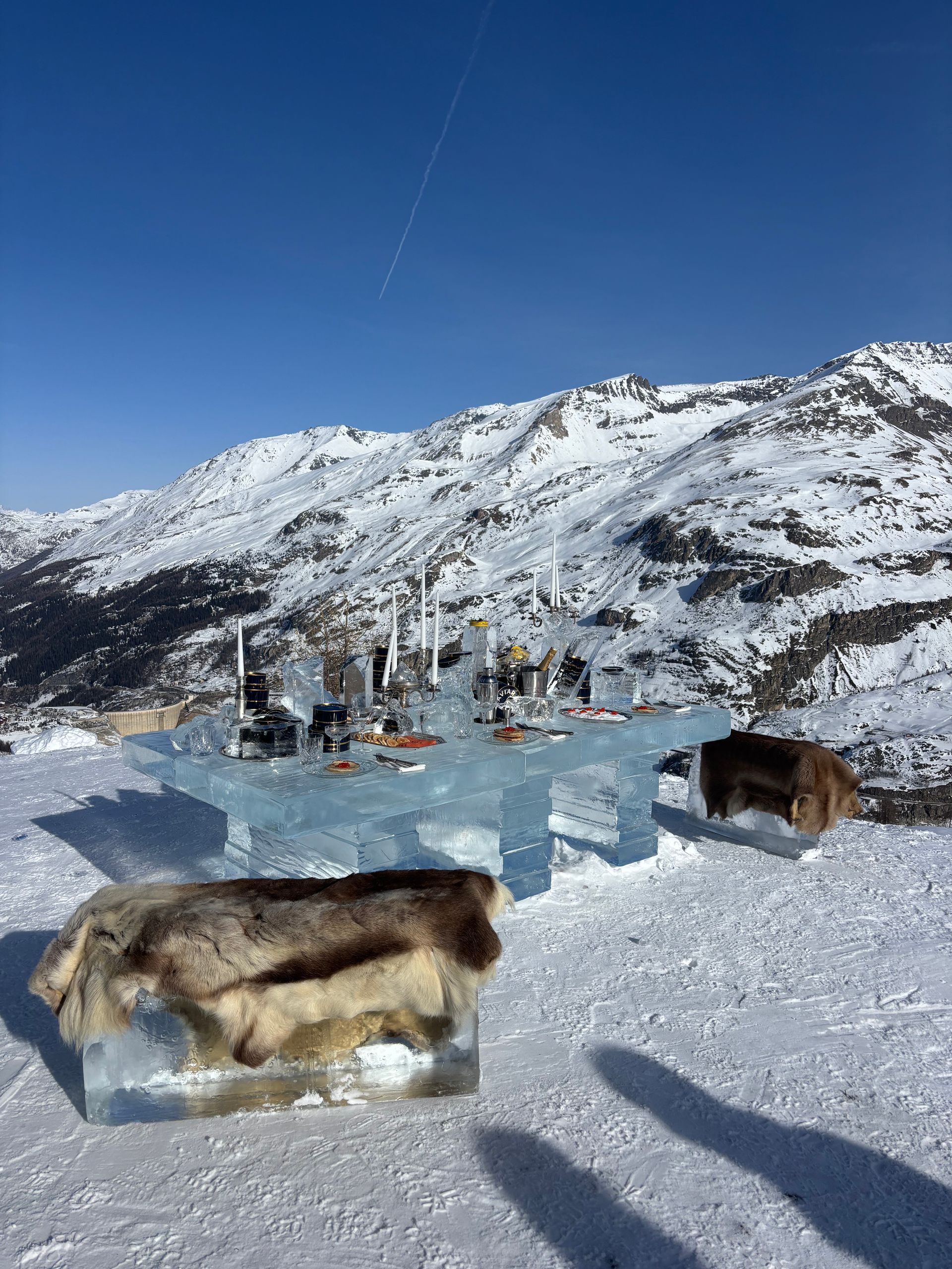 Une table de glace dressée face aux montagnes, un décor naturel spectaculaire, et une mise en scène qui sublime l’art de la table et le produit.